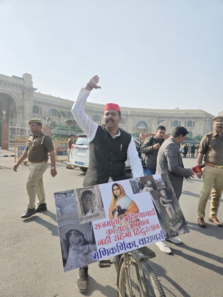 उत्तर प्रदेश विधानसभा के बजट सत्र के पहले दिन वाराणसी में मणिकर्णिका घाट पर मंदिरों के तोड़फोड़ और राजमाता अहिल्याबाई के अपमान पर एमएलसी आशुतोष सिन्हा साइकिल से विधानमंडल पहुंचे।